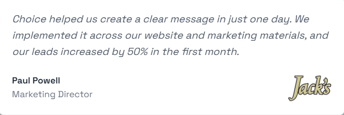 Choice helped us create a clear message in just one day. We implemented it across our website and marketing materials, and our leads…